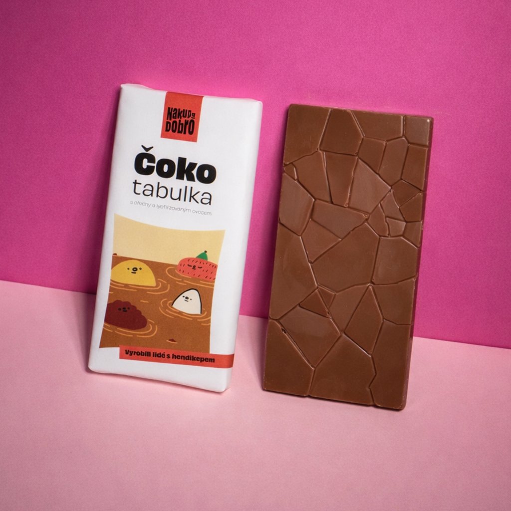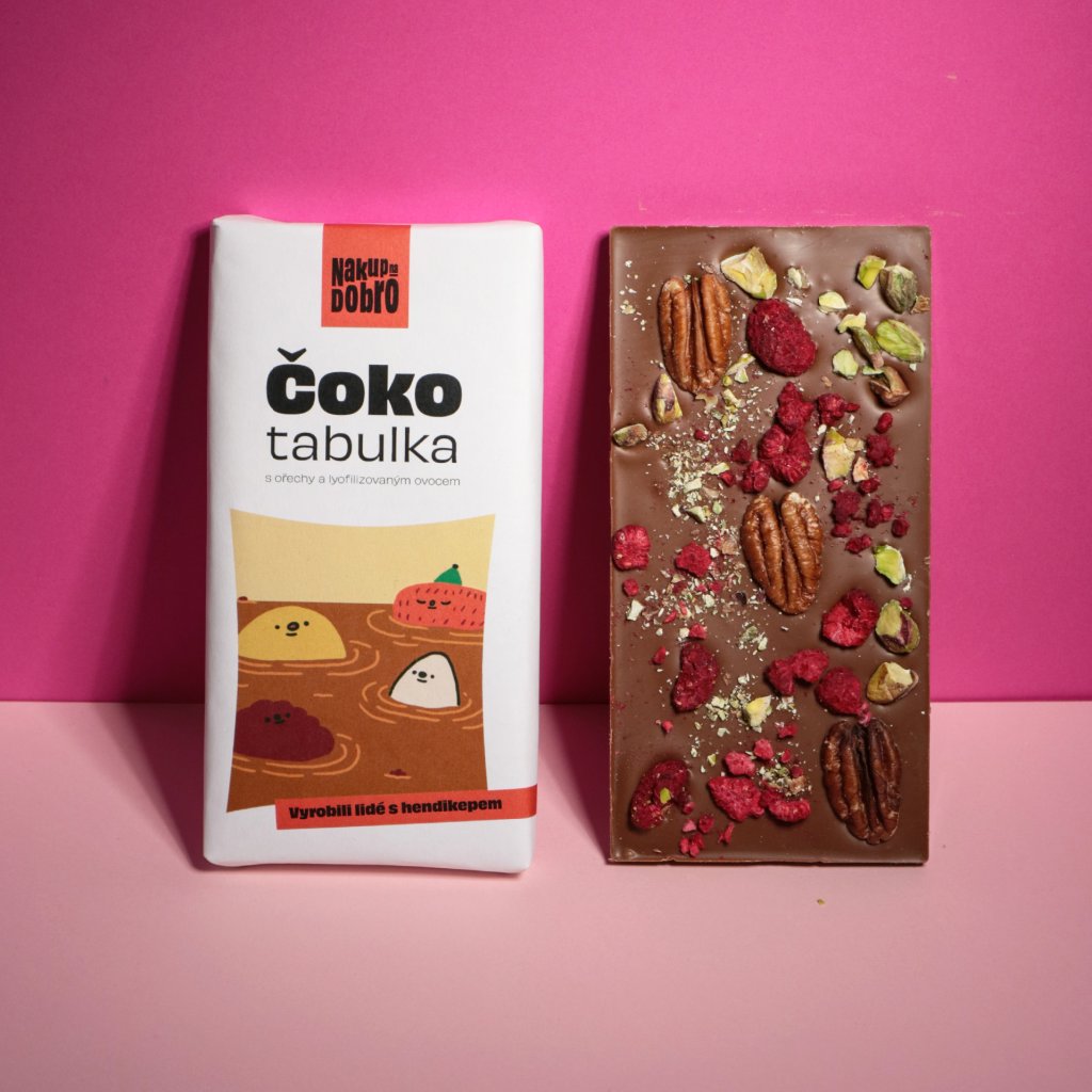 Jemná čokoláda posypaná křupavými ořechy a lyofilizovaným ovocem baví chutěmi i strukturou. Stejně jako u ostatních čokoládových Dobrot se i tady skrývá jedna důležitá ingredience navíc. Poctivá ruční práce lidí s hendikepem, kteří tabulku vyrábějí s pečlivostí, trpělivostí a láskou k řemeslu.