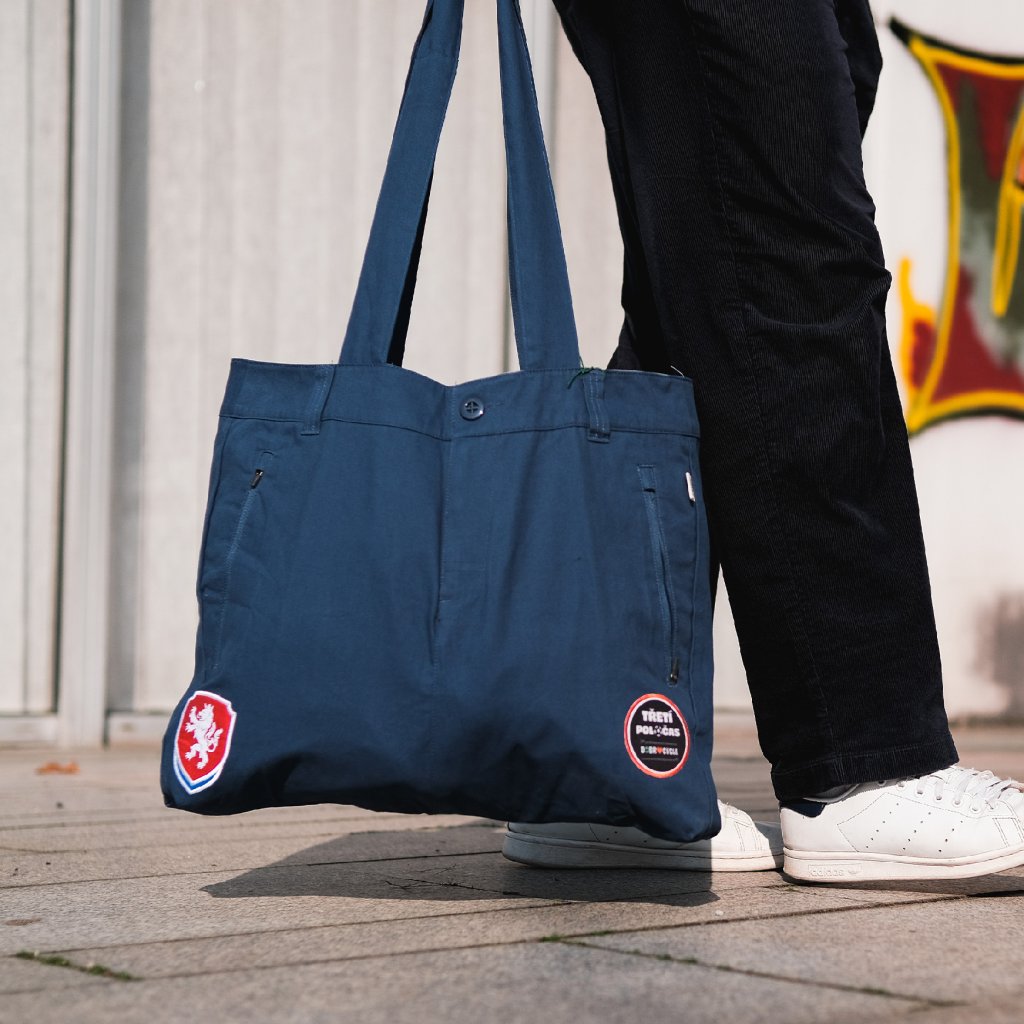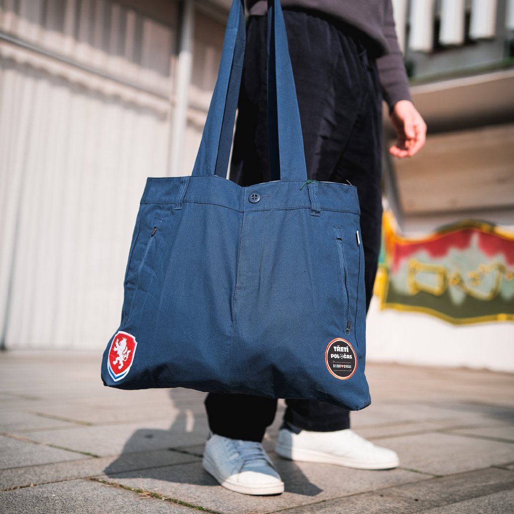 Prostorná taška z reprezentačních kalhot, které pokračují ve svém třetím poločase. Zachovává původní kapsy, zipy i knoflíky, které jí dávají nejen charakter, ale i funkčnost. Ušitá rukama i srdcem švadlenek s hendikepem.